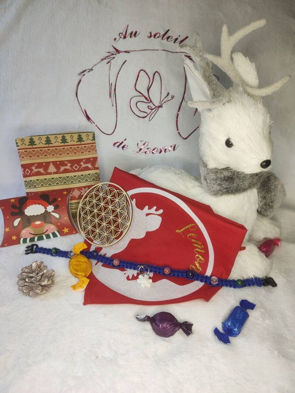 Toutes les box contiennent des friandises saines pour chiens ou chats. Des chocolats pour humains. Un bandana personnalisé. Un collier ou un bracelet de Lithothérapie sur mesure (voir visuel 6 pour les détails) Ainsi qu'une fleur de vie une fleur de vie.